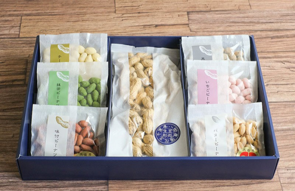 落花生を9種類の味に加工して詰め合わせたセット。「黒蜜きなこ」や「あんこピーナツ」などの甘い系から、辛さで思わず口を押さえてしまう「とんとんとんがらし」まで、いろいろな味を楽しめます。