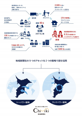 当社は、地域密着型の生活情報誌『ちいき新聞』の発行を軸に、情報発信および販売促進の総合支援事業を展開しており、年間約7,000社にサービスを提供しています。千葉県を中心に毎週発行している『ちいき新聞』は、専属の配布員により174万世帯へポスティングされ、創業以来40年以上にわたり配布を継続してきたことで、他に類を見ない9つのアセットを築いてきました。