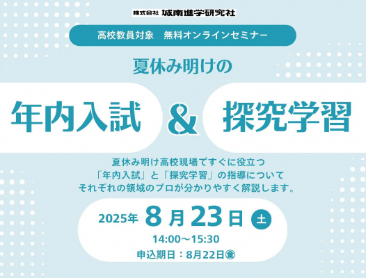 今回のセミナーでは、「年内入試」と「探究学習」の指導について、それぞれの領域のプロがわかりやすく解説します。