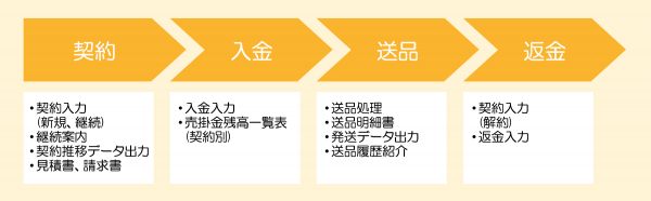 「定期契約管理」は、定期雑誌の購読管理はもちろん、商材を問わず多様な定額制サービスも、一つのシステムで柔軟に管理することが可能となります。