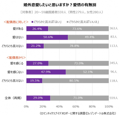 「配偶者に愛がある」と回答した人でも4人に1人が「婚外恋愛したい」と考えています。「配偶者から愛を感じる」と回答した人も同様です。いずれも「どちらとも言えない」と回答した人よりも高い結果に、複雑な気持ちになります。愛はいくつもあるということでしょうか。