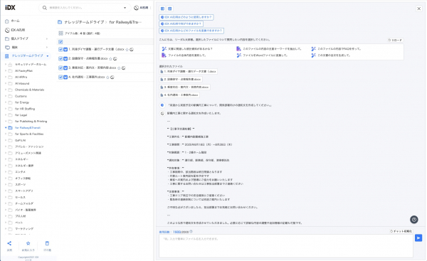 AI孔明が、IDXに集約された文書から必要な情報を検索・要約し、 業務支援を提供。