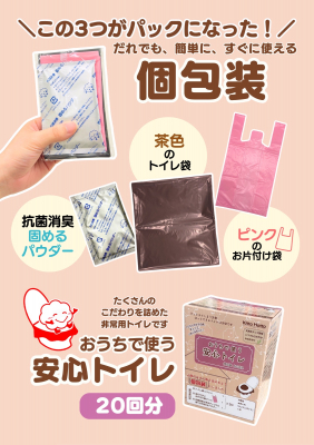 そんな多くの被災された方の声を受けて、『安心トイレ』は1回分ごとに完全密封された“個包装仕様”を採用。