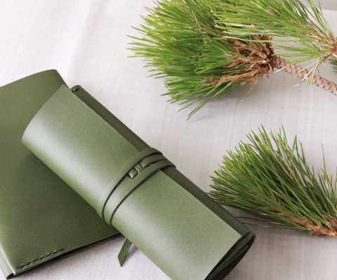 「松葉(深緑)」と「芥子(黄味がかった温色)」という日本の伝統色を配色した、落ち着きと温かみのあるデザインが特徴です。革の質感と相まって、和洋を問わず幅広いシーンに馴染みます。シンプルながらも存在感があり、日常をさりげなく格上げします。