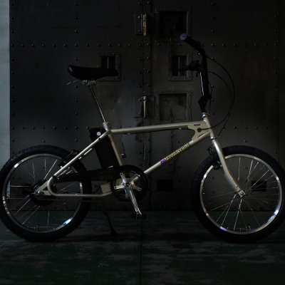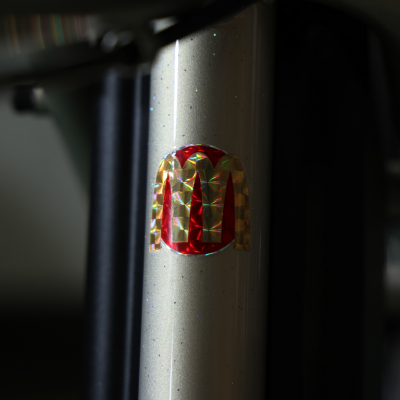 MX-Eの背景にあるUSの70~80年代のカルチャーへのリスペクト、そしてFUJIのルーツである日本の70~80年代の熱量や民族的感性にも焦点を当て、それぞれの象徴的な要素で再構築しました。往年の国内カタログから引用し”FUJI CYCLE”ロゴでアレンジしたロゴデカールは、OLD BMXさながらのホログラム仕様で。一方で、ベースカラーは日本ならではの華美さを感じるアイボリーラメをベースに、追い鰹ならぬ追いラメを贅沢に散りばめています。カスタムするパーツにはブラックではなくシルバーパーツを基調に選定し、当時の大衆娯楽の象徴である競輪車両にも通づる「絶対的な個性」と「芯の通った華やかさ」をまとう一台に。もちろん、FUJIの日の丸に合わせて今回のために作った日の丸仕様の“MNマーク”もポイントです。