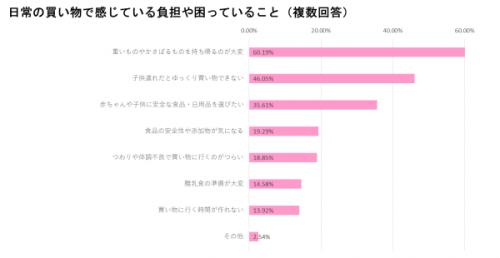 ●子育て世帯の約6割が日常の買い物において「重いものやかさばるものを持ち運ぶ」ことに大きな負担を抱えていることがわかった。