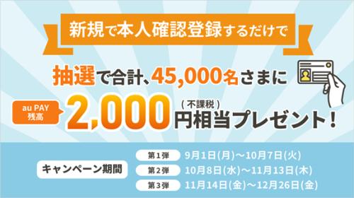 抽選で各期間あたり15,000名(合計45,000名)に、2,000円相当のau PAY 残高を還元