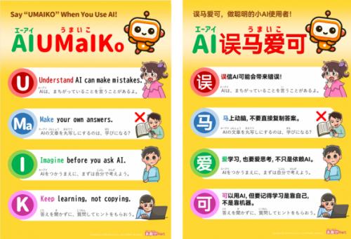 本ポスターは、現職教職員や教育関係者の声を参考に、子どもたちが生成AIを活用する際に意識したい4つのポイントを整理し、その頭文字を使った合言葉「AIうまい子」としてまとめたものです。「正解」を押しつけるのではなく、子どもたち自身がAIとの向き合い方を考えるきっかけとして制作されました。学校、図書館、公共施設などに掲示することで、生成AIとのより良い付き合い方について日常的に意識を高めてもらいたいと考えています。
