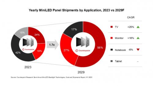 カウンターポイントリサーチの最新版「MiniLEDバックライト技術、コスト、出荷量に関する半期レポート 2025年上半期」によると、世界のMiniLED出荷量は、主にテレビ用途の増加に牽引され、2024年には前年比20%増加する見込みです。タブレット分野では、2022年に最も高い普及率を記録したMiniLEDは、iPad ProがMiniLEDからOLEDに切り替わるため、2025年以降はゼロになると予想されます。一方、AppleのMacBook Proは、MiniLED搭載ノートパソコン市場でトップの座を維持しました。 14.2インチと16.2インチのMacBook Proのパネル出荷総数は、2024年に前年比10%増加しました。しかし、Appleは2027年までにOLEDの採用を開始すると予想されており、この動きはノートパソコンにおけるMiniLEDの成長に大きく影響するでしょう。