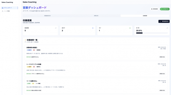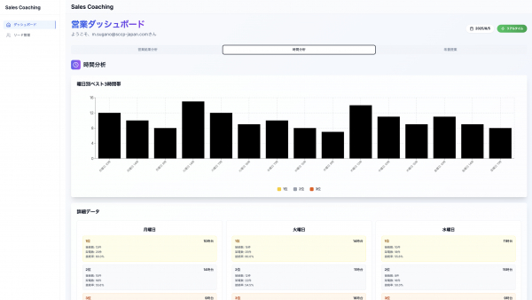 2. 営業プロセス支援ダッシュボード:専用のダッシュボード上で各メンバーの商談状況やKPI進捗を見える化します。これにより、営業チームは目標達成に向けた課題を即座に把握でき、マネージャーは育成やフォローが必要なポイントを把握できます。ダッシュボードには学習履歴も統合され、研修成果と営業成果を紐づけて管理することで、研修内容の効果測定も可能です。
