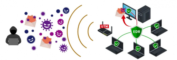 ・ UTMによる外部からの攻撃の遮断: 企業ネットワークの入り口でUTMが異常な通信を検知し、外部からの侵入を防ぎます。