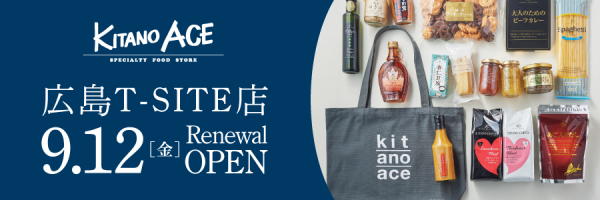 北野エースは、全国の百貨店を中心に110店舗を展開する食料品専門店です。広島県には4店舗(広島T-SITE、さんすて福山、ラクア緑井、楽々園)を展開中。地元の商品をはじめ、日常のお買い物からギフト商品、さらには輸入食材まで、圧倒的な品揃えで「発見する楽しさ」や「選ぶよろこび」をお届けします。駅ビルやショッピングセンターに展開する「KITANO ACE」の業態では、「ふりかけの壁」や「カレーなる本棚(R)」などを設置し、よりバラエティに特化した品ぞろえで皆様のご来店をお待ちしています。