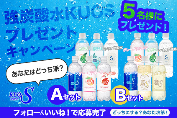キャンペーン期間中に応募された方の中から抽選で、5名様にKUOSシリーズ『強炭酸水KUOSお試し6本セットをプレゼントします。