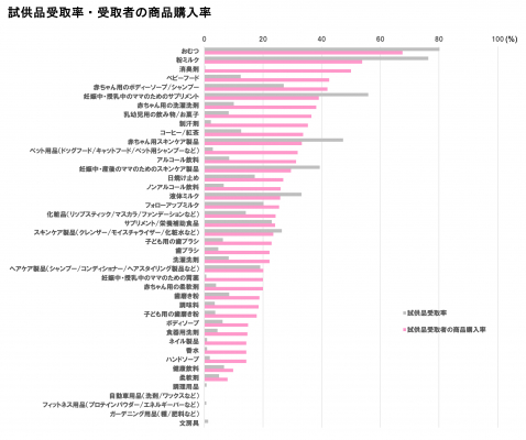 一方で、受取率は低いものの購入率が高い「ベビーフード」「ボディソープ/シャンプー」「洗濯洗剤」なども存在し、日常的に使用頻度が高く比較・試用が求められる商材においては、サンプリングが特に有効であることが明らかとなった。