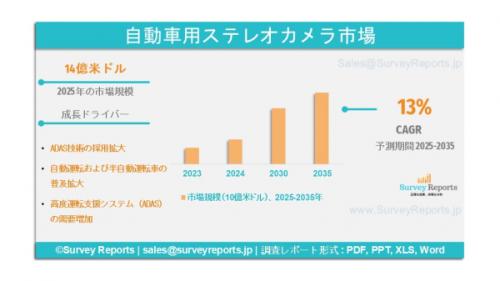 Surveyreportsの専門家による分析によれば、自動車用ステレオカメラ市場の2025年時点での市場規模は14億米ドルに達している。また、2035年末までに市場収益は38億米ドルに到達すると予測されている。予測期間(2025年~2035年)における年平均成長率(CAGR)は約 13% と見込まれている。