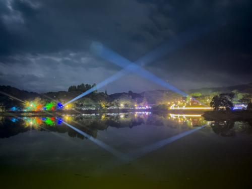 池の新水テラス側から眺めると、背景となる樹木にフルカラーでライティングを施し、水辺への水鏡効果を創り出し、池全体がひとつの光の輪となる演出です。