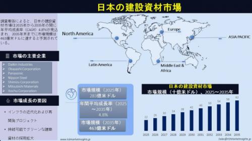 調査報告によると、日本の建設資材市場は2025年から2035年の間に年平均成長率(CAGR)4.8%が見込まれ、2035年末までに市場規模は463億米ドルに達すると予測されている。2025年の市場規模は283億米ドルの収益と評価された。