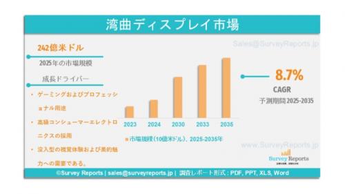 Surveyreports社の専門家による曲面ディスプレイ市場の分析によれば、2025年時点での市場規模は242億米ドル($24.2\ \text{billion}$)であった。さらに、2035年末までに市場収益は467億米ドル($46.7\ \text{billion}$)に達すると予測されている。予測期間である2025年から2035年にかけて、市場は年平均成長率約8.7%($\text{CAGR} = 8.7%$)で拡大する見込みである。