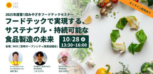 「フードテックで実現する、サステナブル・持続可能な食品製造の未来」をテーマに、フードテックの最新動向や、フードテックに取り組む県内企業と共に、宮崎県における食品製造のポテンシャルや可能性について探ります。