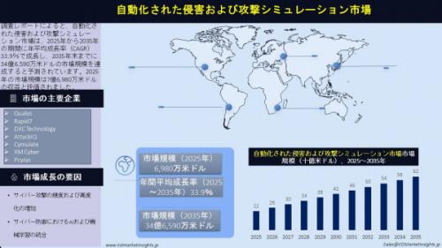 調査レポートによると、自動化された侵害および攻撃シミュレーション市場は、2025年から2035年の期間に年平均成長率(CAGR)33.9%で成長し、2035年末までに34億6,590万米ドルの市場規模を達成すると予測されています。2025年の市場規模は7億6,980万米ドルの収益と評価されました。