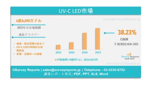 Surveyreports社の専門家たちは、UV-C LED市場調査を分析し、2023年のUV-C LED市場規模が4億6,070万米ドルであることを明らかにしました。さらに、UV-C LED市場シェアは、2033年末までに87億米ドルに触れる収益を予見しています。UV-C LED市場は、2024年と2033年の予測期間に約38.23%のCAGRで成長する見込み。