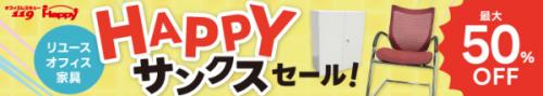 この”HAPPYサンクスセール”は、11月4日(火)から12月26日(金)までの期間中、国内5店舗およびオンラインストアを加えた合計6店舗で開催いたします。リユース商品の数には限りがございますので、新規オフィスの開設やオフィスの移転等でリユース家具の購入をご検討の際は、この機会を是非ご利用ください。
