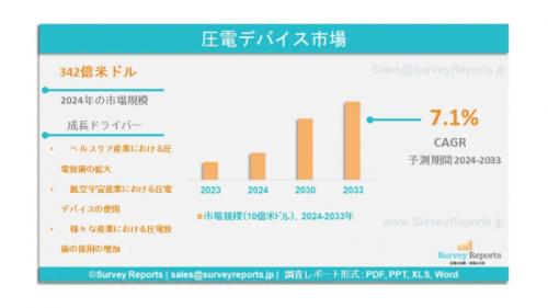 Surveyreportsの専門家は圧電素子市場の調査を分析し、2024年に圧電素子市場規模が342億米ドルに達すると予測した。さらに、圧電素子市場のシェアは、2033年末までに623億米ドルの収益に達すると予測されている。圧電素子市場は、2024年から2033年の予測期間にわたって、年間平均成長率(CAGR)約7.1%で成長すると予測されている。
