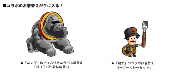 「ゴーゴーカレーのアバたま」に城ドラキャラのボイス付きコラボお着替えとして、コングの「ゴリ子(CV:若林倫香)」が登場!さらに剣士のコラボお着替え「ゴーゴーカレーセット」も登場いたします。アバたまを割って、コラボ期間中にしか手に入らない限定お着替えを手に入れましょう!