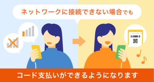 本機能により、通信状態が悪い状況において、au PAY アプリのホーム画面にオフライン決済のご案内が表示されるようになります。お客さまがアプリ上で「オフラインコード支払い」画面を表示し、店舗側が表示されたコードを読み取ることで支払いが可能です(注2)。