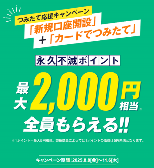 キャンペーン期間中にクレディセゾンを経由してセゾン投信に新規口座を開設し、「カードでつみたて」で投資信託を買付した方全員に、永久不滅ポイント最大2,000円相当(400ポイント)がプレゼントされます。