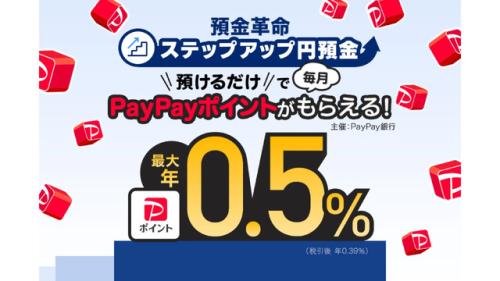 この新機能では、「PayPayポイント」の受け取りを選んだユーザーは、預金革命「ステップアップ円預金」で受け取れる「利息」より0.1%高い最大年0.5%(税引後年0.39%)の付与率で、「利息」のように毎月「PayPayポイント」を受け取れます。
