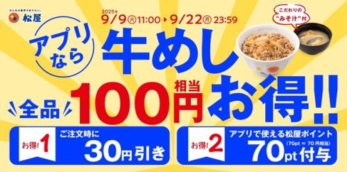 今回のキャンペーンでは、こだわりのみそ汁付きの松屋の「牛めし」が実質100円相当お得になります。キャンペーン実施期間は9月9日(火)11:00から9月22日(月)23:59までで、期間中であれば何度でも利用できます。