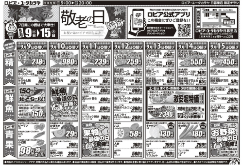 普段の食卓に欠かせない野菜や肉の特価に加え、7日間連続で楽しめるお買い得商品も多数登場!敬老の日に向けて、家族で囲む食卓にもぴったりな内容となっています。