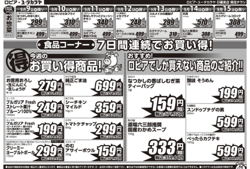 ロピア日暮里店では、9月15日(月・敬老の日)までの期間限定で、毎日のお買い物に役立つ特売アイテムが用意されています。