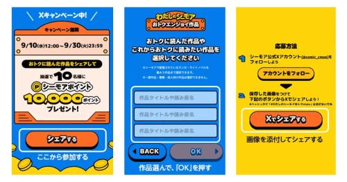 「わたしのシーモアおトクスタイル」で生成した画像をX(旧Twitter)でシェアすると、抽選で10名にコミックシーモアで使える10,000ポイントが当たるキャンペーンも開催されます。