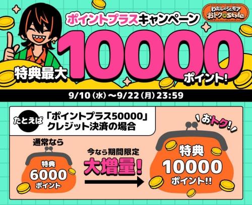 期間中にシーモアポイントをお得に購入できる「ポイントプラスキャンペーン」を開催します。通常よりも特典ポイントが増加し、クレジットで決済すると特典ポイントを最大10,000ポイント獲得できます。