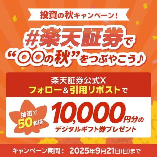 楽天証券株式会社は、2025年9月10日(水)から9月21日(日)まで、公式Xアカウント(@RakutenSec)において「投資の秋キャンペーン」を実施しています。