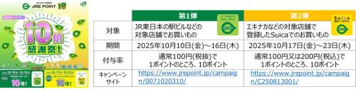 JR東日本の共通ポイントサービス「JRE POINT」は、2026年2月23日(月・祝)に10周年を迎えることを記念し、特別なキャンペーンや企画を開始します。今回の10周年記念キャンペーンは、駅ビルやエキナカなどでのお買い物で通常の10倍のポイントが貯まる「JRE POINT10倍感謝祭!」からスタートします。また、同期間中に駅ビル各社でもオリジナルキャンペーンが開催されます。