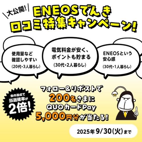 ENEOS Powerは、同社が提供する電力サービス「ENEOSでんき」に関する「大公開!ENEOSでんき口コミ特集キャンペーン」を、2025年9月8日(月)から開始しました。
