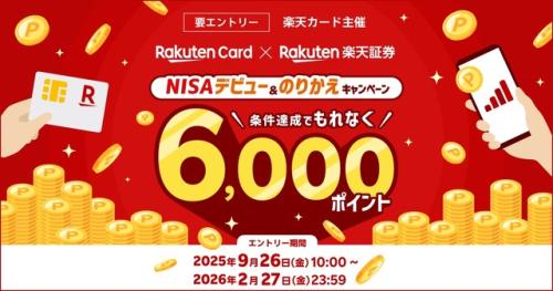 楽天カードは、楽天証券で新たにNISA口座を開設、または他社の金融機関から乗り換える利用者を対象とした「もれなく6,000ポイント!NISAデビュー&のりかえキャンペーン」を開始しました。