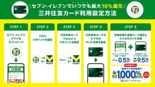 本キャンペーンは、2024年10月15日(火)より開始したセブン-イレブンで最大10%のVポイントが貯まる・使えるサービスを拡充するものです。セブン-イレブンアプリに「7iD」と「V会員番号」を連携して利用設定を行い、三井住友カードのスマホのタッチ決済で支払うと、いつでも最大10%のVポイントが還元されます。さらに、毎週金曜日限定で「VポイントPayアプリ」のスマホのタッチ決済利用時に最大10%のVポイント還元サービスも提供しています。