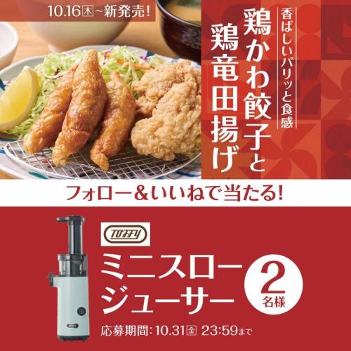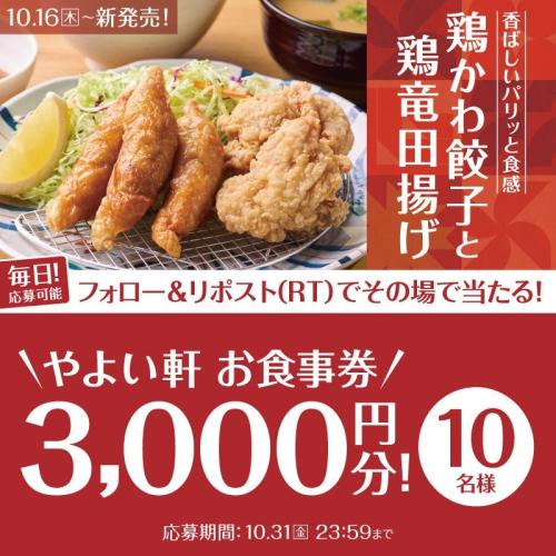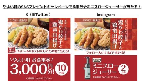 プレナスが運営する定食レストラン「やよい軒」は、新商品『鶏皮餃子と鶏竜田揚げの定食』の発売を記念し、2025年10月16日(木)から10月31日(金)までの期間限定で、公式SNSアカウントにてプレゼントキャンペーンを実施します。