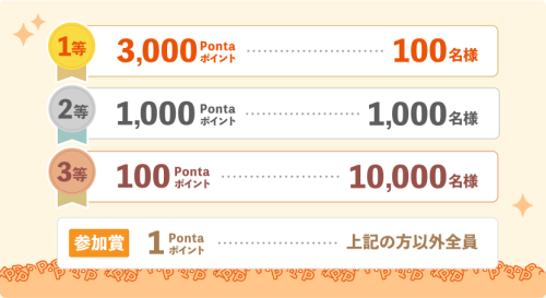 本キャンペーンでは、特典として抽選でPontaポイントが進呈されます。当選すると最大で3,000ポイントが加算されるほか、キャンペーンに参加した方全員にもれなく1ポイントがプレゼントされます。