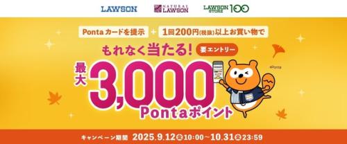 2025年10月31日(金)までの期間中、キャンペーンにエントリーし、対象店舗でPontaカードを提示して買い物をすると、抽選で最大3,000 Pontaポイントが当たります。