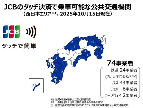 2025年10月15日(水)時点で、西日本エリアでは74の事業者がJCBのタッチ決済に対応しています。対象は鉄道や路線バスだけでなく、空港連絡バス、都市間高速バス、フェリー、ロープウェイなど多岐にわたります。