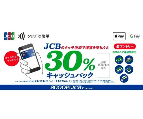 ジェーシービーは、2025年10月16日(木)から11月15日(土)までの期間、「JCBのタッチ決済で公共交通機関に乗ろう!30%キャッシュバックキャンペーン」を実施します。