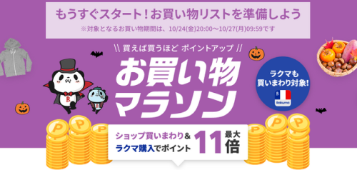 楽天グループは、ポイント還元キャンペーン「お買い物マラソン エントリー&ショップ買いまわりでポイント最大10倍」を開催します。エントリー期間は2025年10月22日(水)10:00から10月27日(月)9:59まで、ポイントアップ期間は2025年10月24日(金)20:00から10月27日(月)9:59までです。