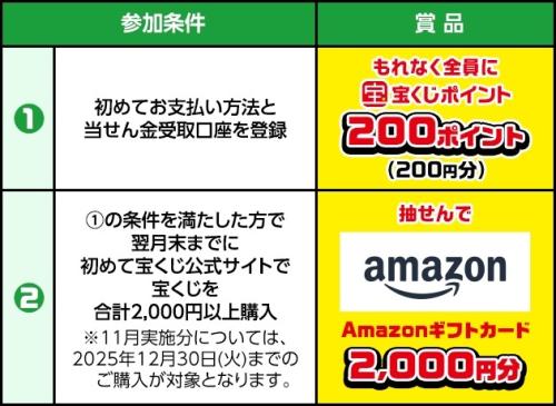 2025年12月1日(月)以降に支払い方法と当せん金受取口座を登録した場合、初回購入で当たる賞品(Amazonギフトカード 2,000円分)の種別が変更になる可能性があります。