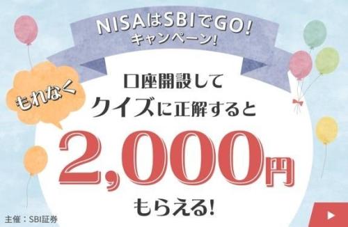 こちらはSBI証券が主催するキャンペーンです。新たにSBI証券でNISA口座を開設し、指定のクイズに正解すると、2,000円が進呈されます。