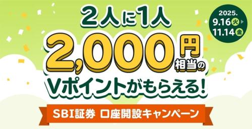 SBI証券の口座開設で2人に1人、2,000円相当のVポイントが当たる!キャンペーン